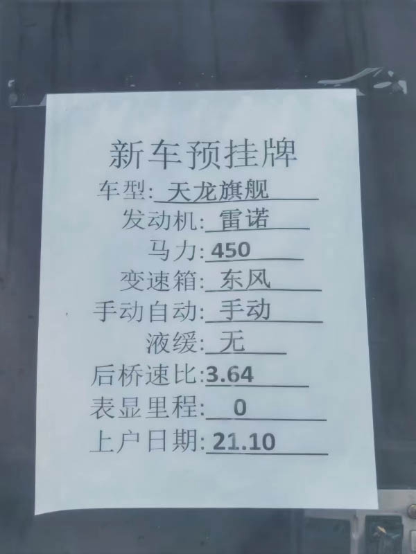 2021年10月上户 雷诺发动机450马力 东风变速箱 手动沃尔沃 手动挡不带液缓 后桥速比:3.64 新车预挂牌,可提档可分期,全国上户